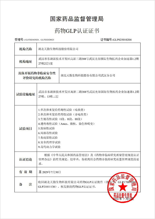 日前,國家藥品監(jiān)督管理局對湖北天勤生物武漢分公司(以下稱“天勤生物武漢分公司”)執(zhí)行《藥物非臨床研究質(zhì)量管理規(guī)范》(以下稱GLP)的情況進(jìn)行了為期1周的定期現(xiàn)場檢查,結(jié)果均順利通過。