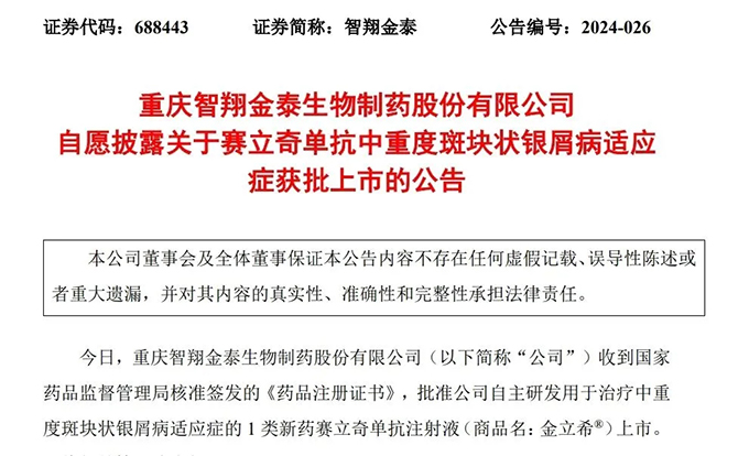 8月27日,重慶智翔金泰生物制藥股份有限公司(以下稱“智翔金泰”)自主研發的1類新藥賽立奇單抗注射液(商品名:金立希?)獲得國家藥品監督管理局(NMPA)核準簽發的《藥品注冊證書》,正式獲批上市。天勤生物子公司湖北天勤鑫圣生物科技有限公司(以下稱“天勤鑫圣”)為該項目提供了部分臨床前安全性評價試驗服務,全力助推該產品順利獲批上市。